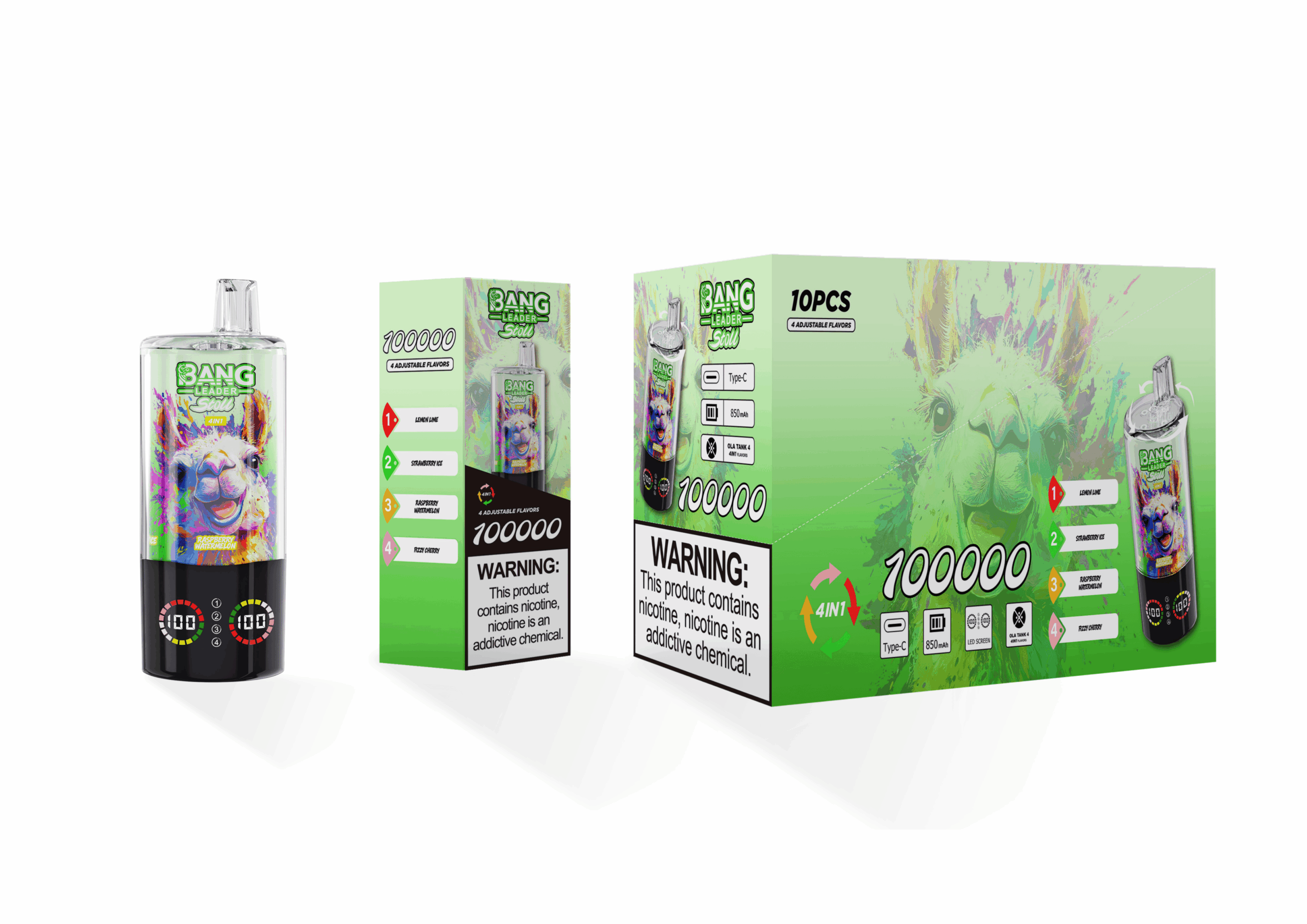 El Bang Leader 100k combina 4 sabores - lima limón, fresa hielo, frambuesa sandía y cereza efervescente - en un solo dispositivo. Con 100.000 caladas, 56 ml de e-líquido, bobina de malla, batería de 850 mAh, carga USB-C y pantalla LED inteligente. Niveles de nicotina: 0-5 %. Cumple con la TPD.