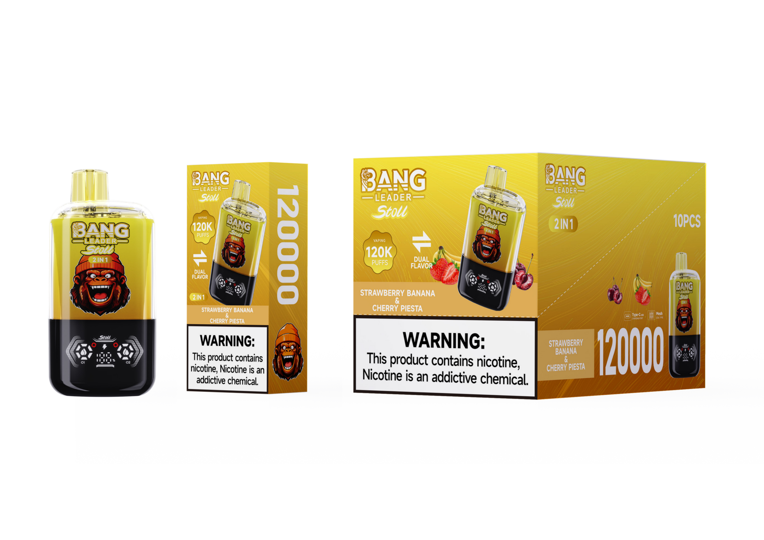El vapeador desechable Bang Leader 120k Strawberry Banana/Cherry Piesta combina dos sabores en un solo dispositivo. Con 120.000 caladas, 60 ml de líquido, bobina de malla, pantalla OLED y batería recargable de 650 mAh (Tipo-C). Disponible en nicotina 0 %, 2 %, 3 % y 5 %.
