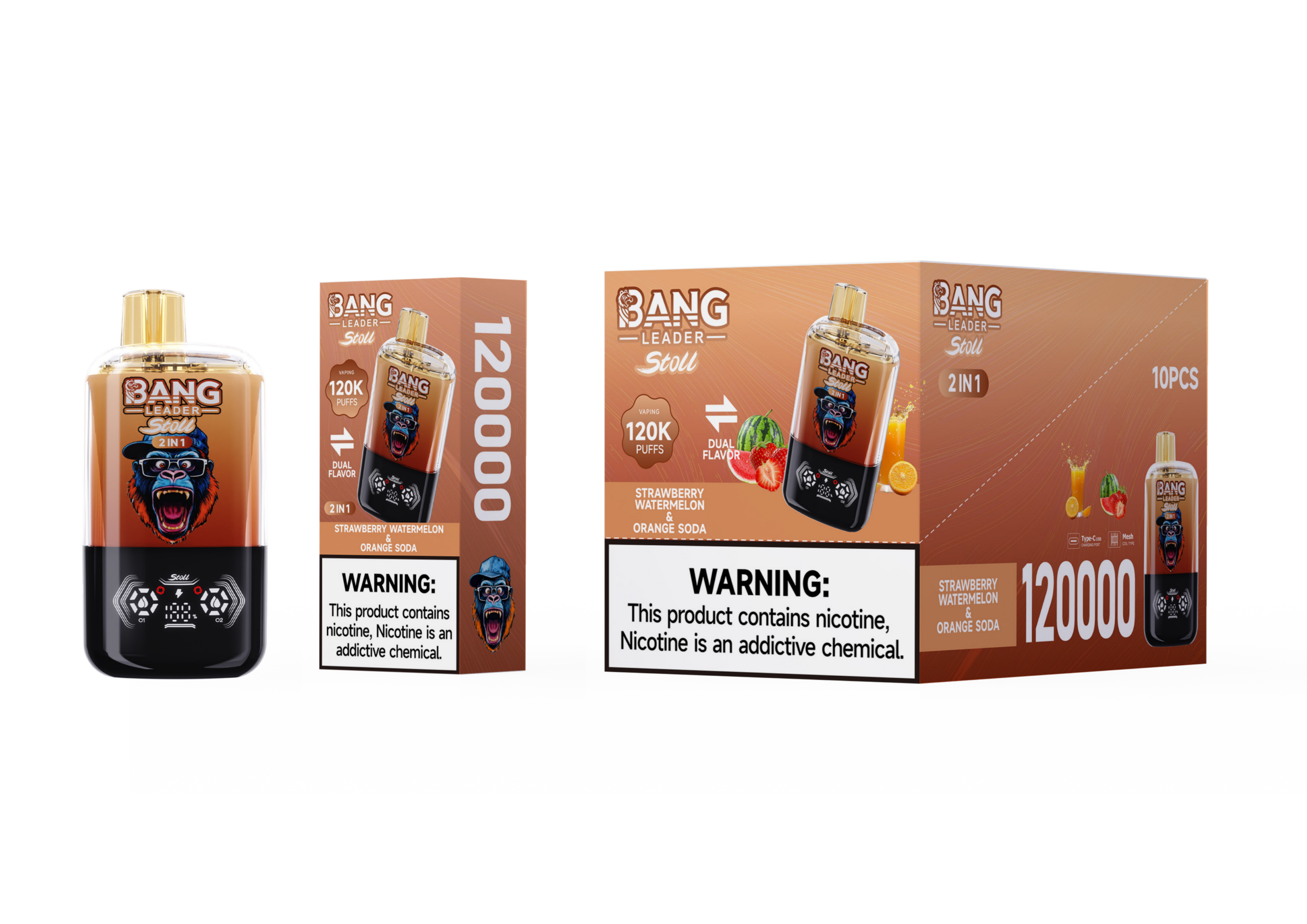 El vapeador desechable Bang Leader 120k Strawberry Watermelon/Orange Soda combina dos sabores en un solo dispositivo. Con 120.000 caladas, 60 ml de líquido, bobina de malla, pantalla OLED y batería recargable de 650 mAh (Tipo-C). Disponible en nicotina 0 %, 2 %, 3 % y 5 %.
