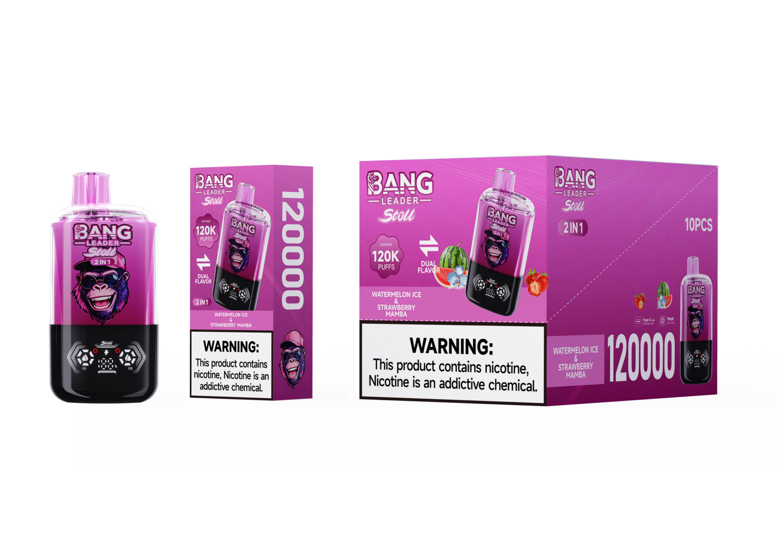 El Bang Leader 120k Watermelon Ice/Strawberry Mamba combina dos sabores distintos en un dispositivo compacto y potente: el refrescante Watermelon Ice en un canal y el vibrante y dulce sabor afrutado Strawberry Mamba en el otro. Con 120.000 caladas, 60 ml de capacidad de e-líquido y una batería recargable de 650 mAh con puerto de carga Type-C, este vapeador desechable está diseñado para ofrecer el máximo tiempo de uso. La tecnología de bobina de malla y la pantalla OLED garantizan una calidad constante. Disponible en 0 %, 2 %, 3 % y 5 % de nicotina.