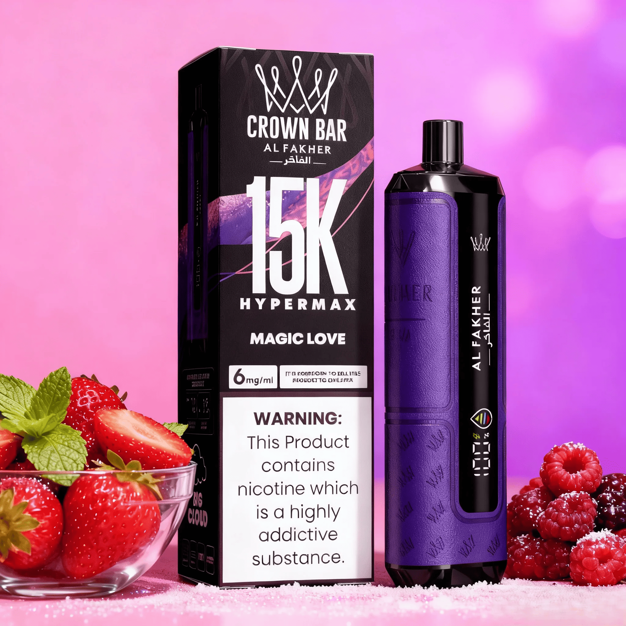 Der AL Fakher 15000 Hypermax Magic Love vereint ein romantisch-süßes Aromaprofil mit technischer Hochleistung. Die großzügige Kapazität von 15.000 Zügen und das 30-ml-Reservoir sorgen dafür, dass das intensive Geschmackserlebnis lange anhält – ohne Qualitätsverlust oder Aromaabfall.