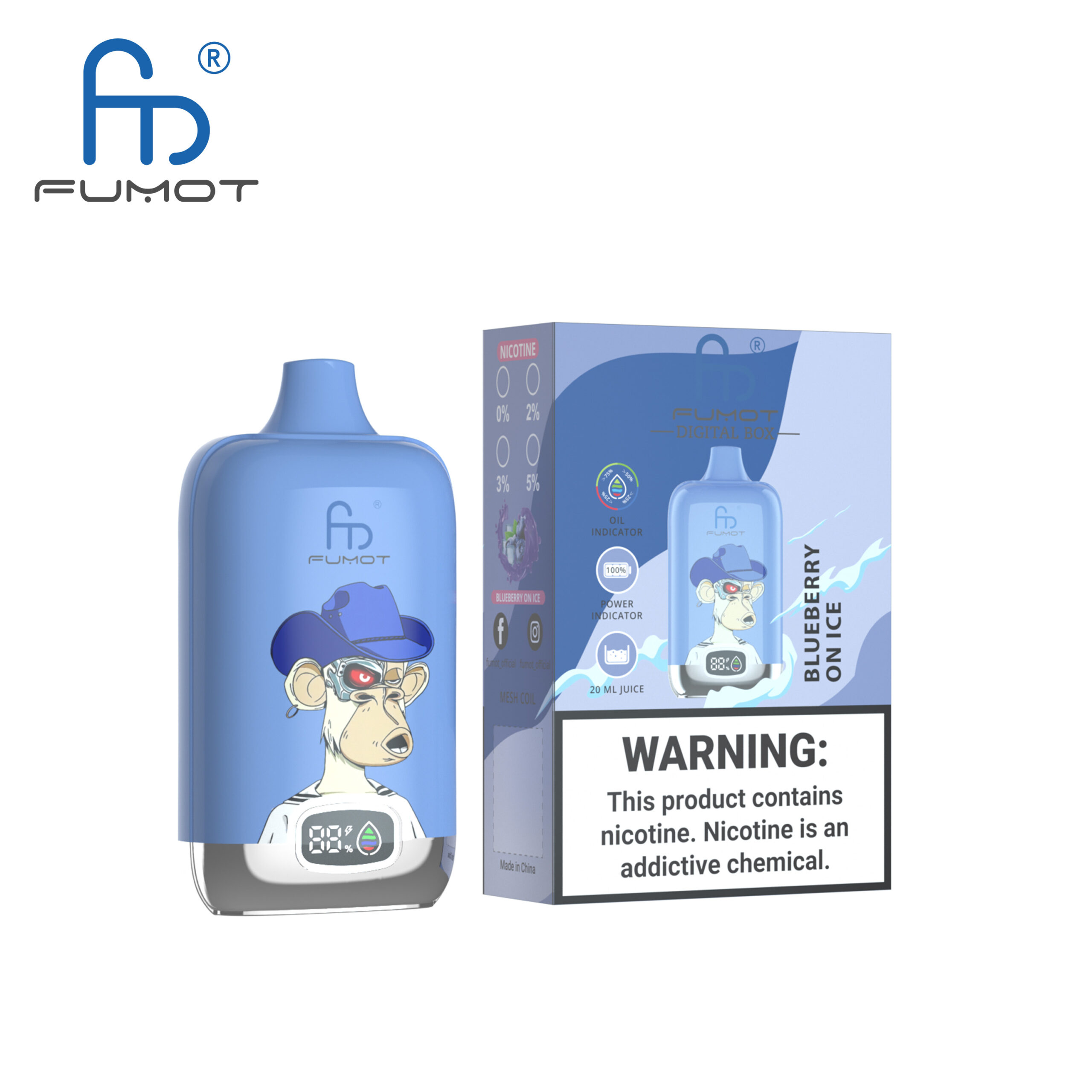 Die Fumot Digital Box 12000 Blueberry On Ice vereint sรผรe Heidelbeeren mit Menthol-Kick. LED-Display zeigt Akku- und Liquidstand, 20ml Kapazitรคt bietet bis zu 12000 Zรผge. Wiederaufladbarer 850mAh-Akku, erhรคltlich in 0%-5% Nikotinsalz. Fruchtig-frische Kรผhle!