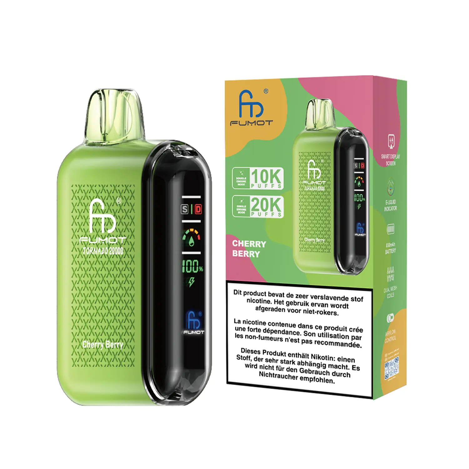 Die Fumot Tornado 20000 Cherry Berry Einweg-Vape bietet eine harmonische Verschmelzung verschiedener Beerenfrรผchte. Ausgestattet mit innovativer Dual-Mesh-Coil-Technologie und einem informativen LED-Display, das Echtzeitdaten zu Akku und E-Liquid anzeigt, liefert dieses Gerรคt bis zu 20.000 genussvolle Zรผge bei 20 ml Fรผllvolumen. Erhรคltlich in verschiedenen Nikotinstรคrken (0%/2%/3%/5%) und mit einem 850mAh Akku ausgestattet, der sich รผber Type-C bequem aufladen lรคsst.