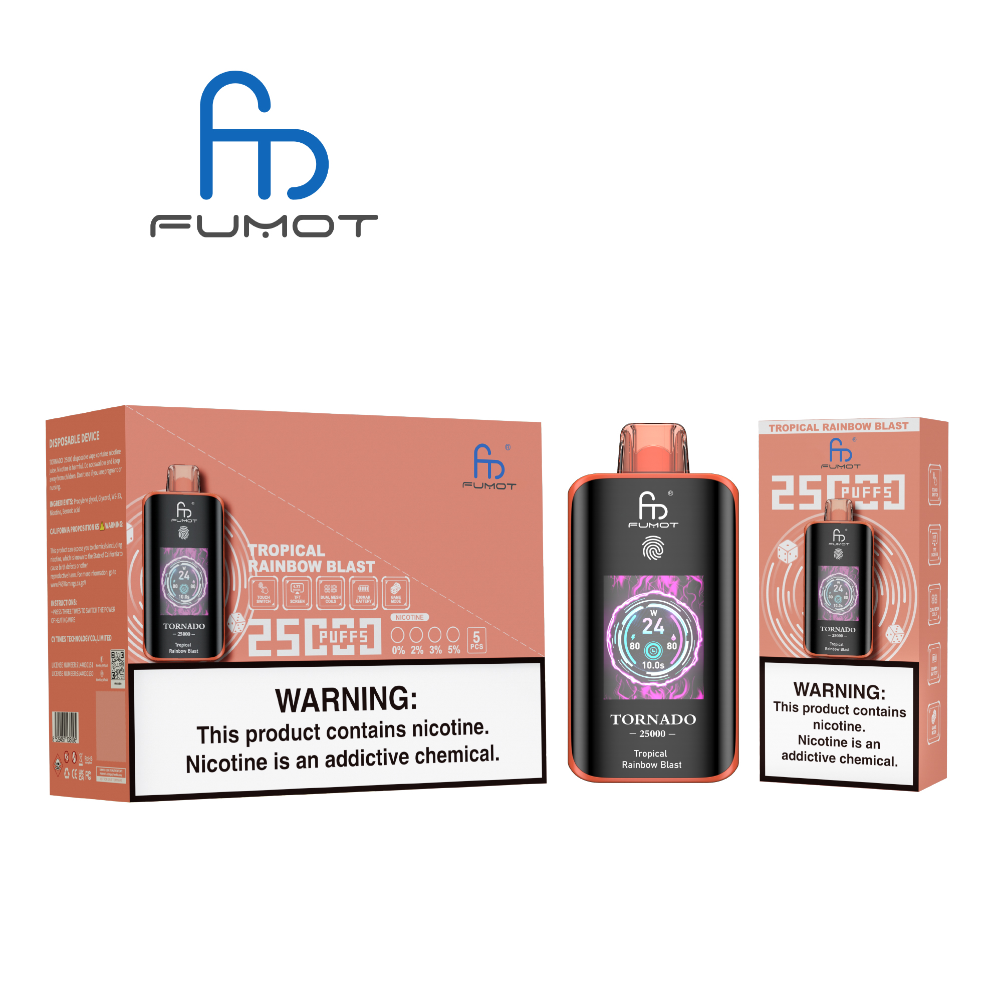 Fumot Tornado 25000 Tropical Rainbow Blast bietet ein explosives Kaleidoskop tropischer Frรผchte. 25.000 Zรผge, 20ml Liquid und Dual Mesh Coil fรผr exotische Vielfalt. 1,77″ TFT-Display, 700mAh wiederaufladbarer Akku mit Typ-C Port. Touch-Steuerung. Nikotinstรคrken: 2%, 3%, 5%.
